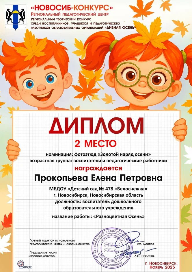 Региональный конкурс творческих работ "Новосиб-конкурс""Дивная Осень", кейс методических разработок, нод "В гости к Осени", диплом 2 степени, ноябрь 2025 г.