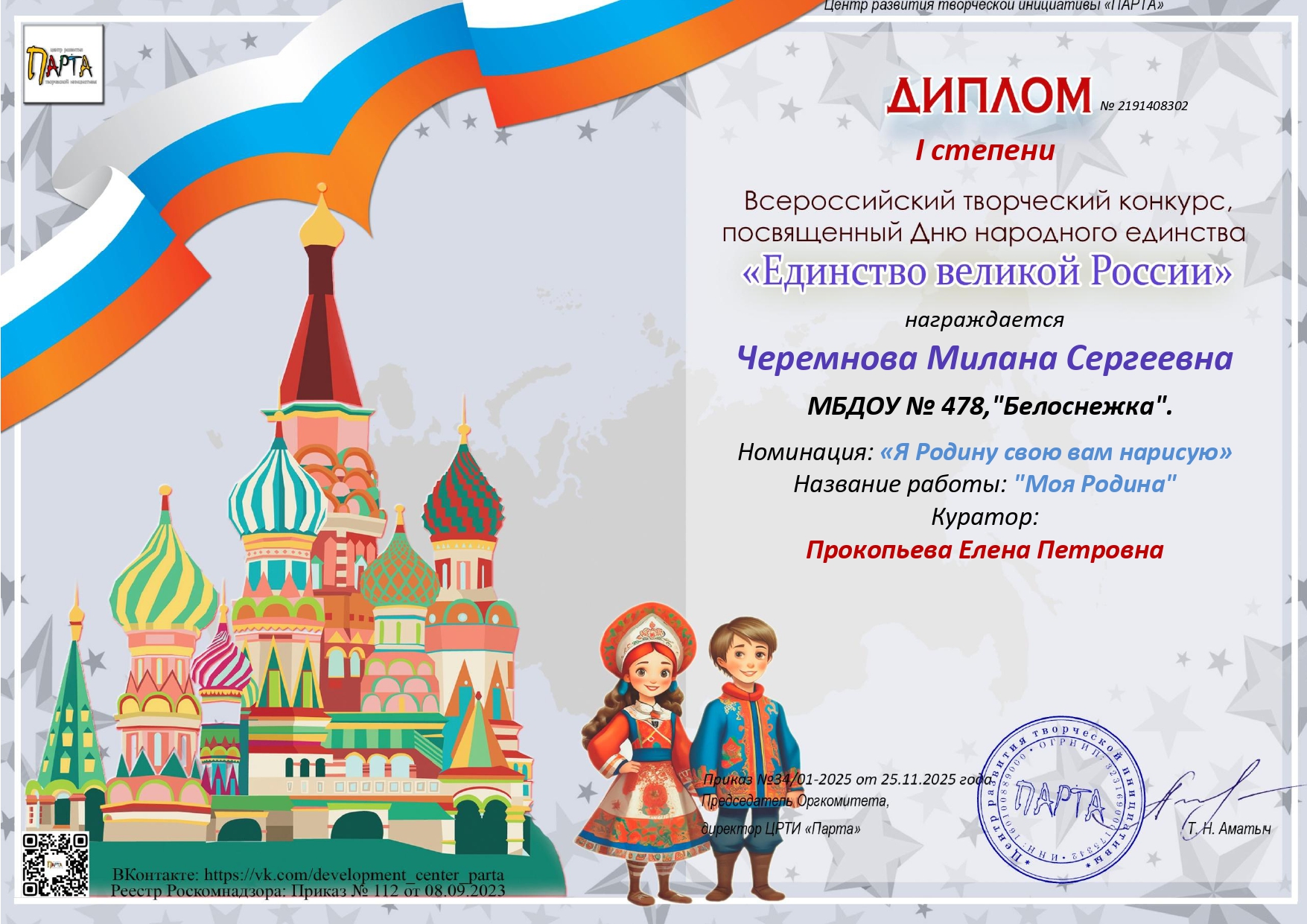 Всероссийский творческий конкурс, посвященный Дню Народного Единства, Черемнова Милана, диплом 1 степени, 25.11.25 г.
