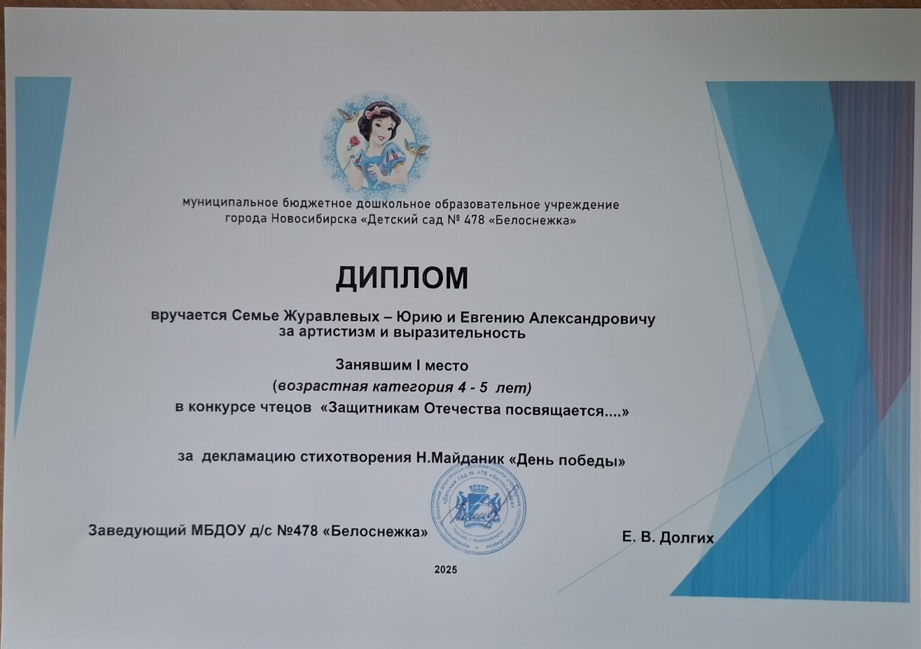 Диплом Семье Журавлевых, занявшим 1 место в конкурсе чтецов "Защитникам Отечества посвящается", стихотворение Н Майданик День Победы", МБОУ № 478, "Белоснежка", 2025 г.